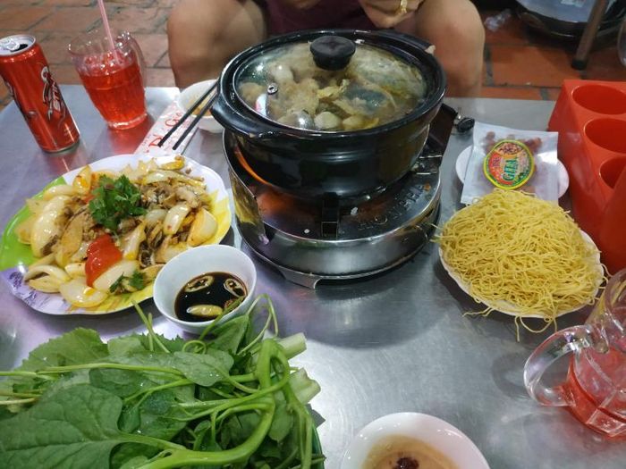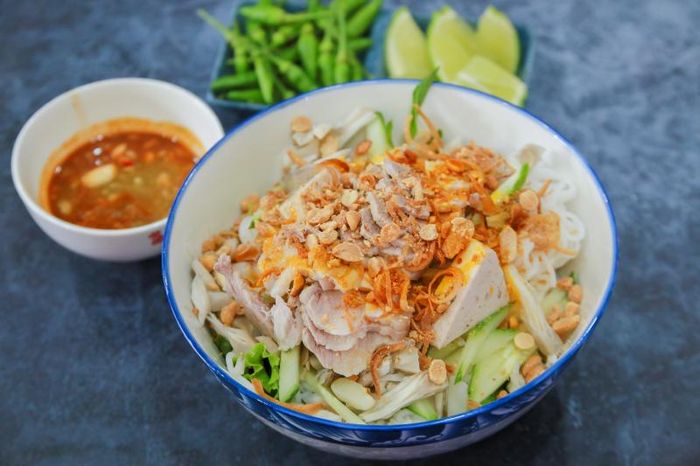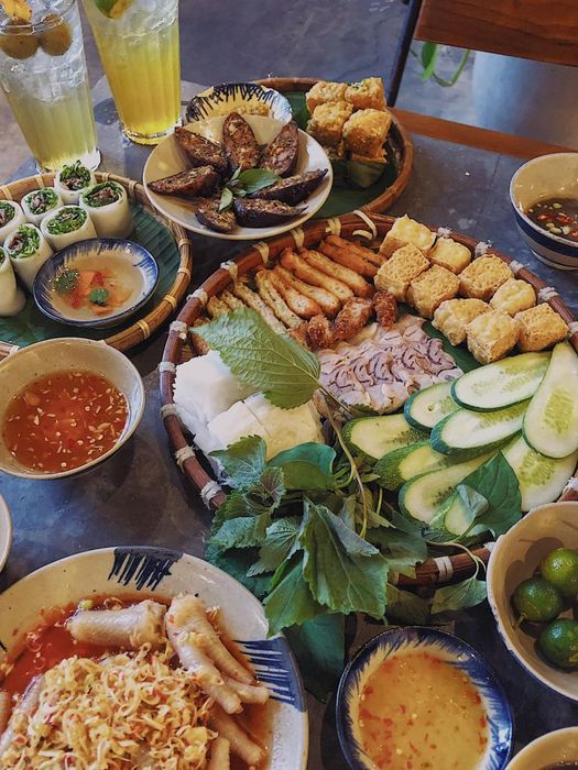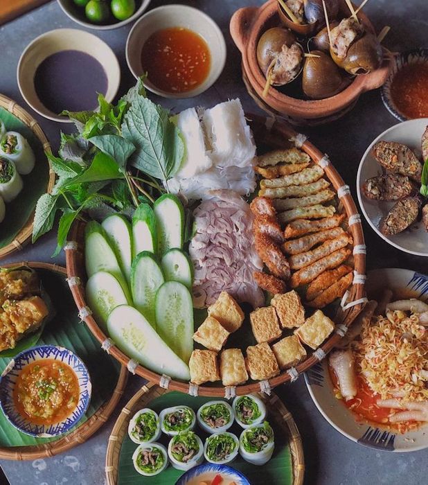 A serving of Fermented Shrimp Paste Vermicelli for two at the restaurant includes large slices of pork belly, crab cakes, green rice cakes, sour pork, tofu, and tightly packed vermicelli that are irresistibly delicious. Besides the signature dish, Bean Tray also offers many other great options like pho rolls, tofu with salted egg sauce, fried intestines, fried sausages, stuffed snails, and beef hotpot, all served with equal attention to presentation and flavor.