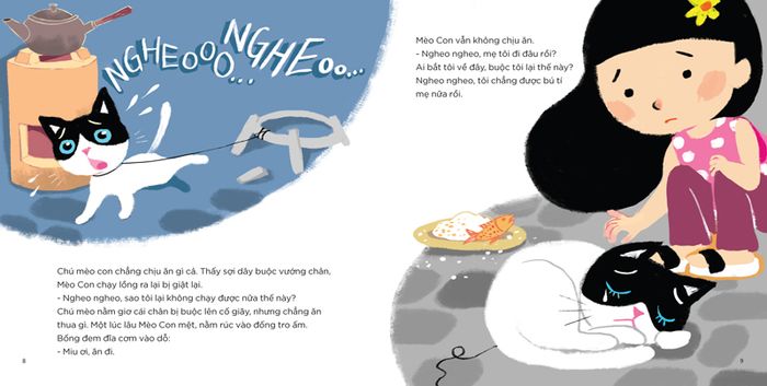 Chú Mèo Con không chịu ăn gì cả. Cảm giác sợi dây bám chặt chân, chú Mèo Con cố gắng đạp chân lên nhưng không thành công. Lâu lắm chú Mèo Con mệt, nằm xuống trong đống tro ấm.