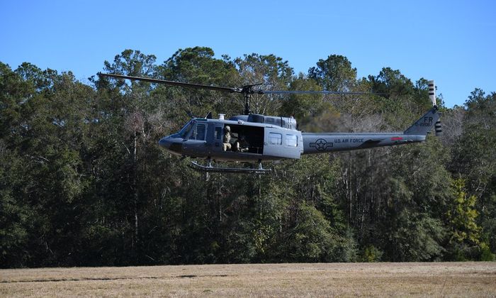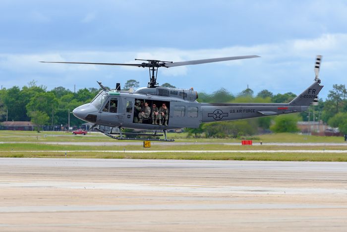 Một phiên bản mới của UH-1, gọi là TH-1H, của Phi đội huấn luyện bay số 23 thuộc Không quân Hoa Kỳ (US Air Force) trong chuyến bay tưởng nhớ một cựu chiến binh gần Samson, Alabama vào ngày 21 tháng 11 năm 2022. Nó còn có tên gọi phổ biến là 'Huey'. Ảnh: Outono.