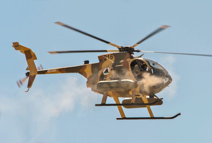 Trực thăng MD 500 Defender của Không quân Afghanistan bắn súng máy trong một cuộc trình diễn truyền thông ngoài thủ đô Kabul, Afghanistan, vào ngày 9 tháng 4 năm 2015. Ảnh: Wikipedia.