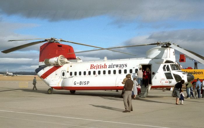 Chiếc trực thăng Chinook mang tên 234LR của hãng British Airways tại Sân bay Aberdeen, Scotland năm 1985. Các phiên bản dành cho dân sự thường được sơn màu sáng hơn so với phiên bản quân sự. Ảnh: Wikipedia.
