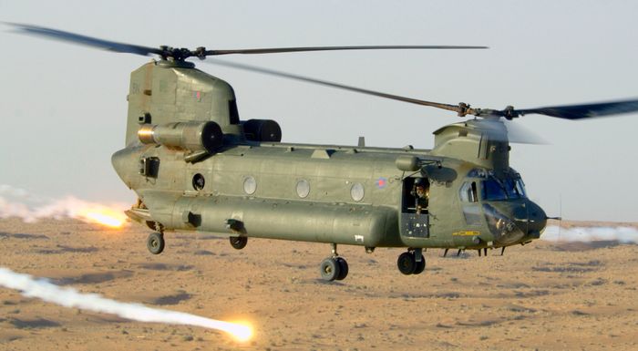 Một chiếc Chinook, có tên ZA718 Bravo November, cùng loại với chiếc trong Chiến tranh Falklands, đang thả pháo sáng khi bay trên sa mạc để hỗ trợ quân đội Anh tại tỉnh Helmand, phía nam Afghanistan năm 2006. Ảnh: Wikipedia.