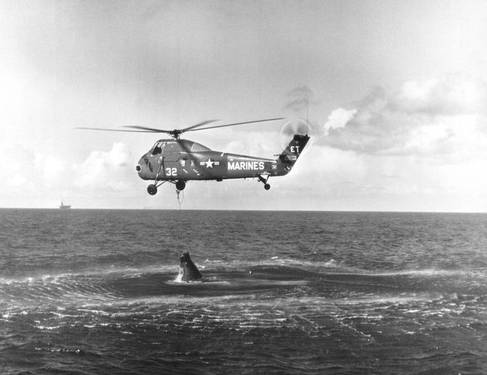 Một trong những nhiệm vụ đáng chú ý của H-34: Khi cửa Liberty Bell 7 mở sớm, nước biển đổ vào tàu. Một chiếc trực thăng Huss đã cố gắng hút nước, nhưng sau đó phải thả tàu vũ trụ vì quá nặng, và tàu chìm. May mắn, phi hành gia sống sót. Ảnh: Wikipedia.