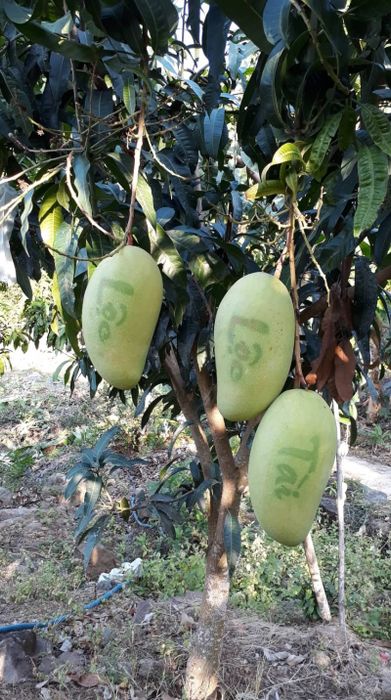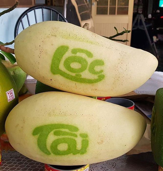 Trong không khí Tết Nguyên đán, trái xoài không chỉ là một loại trái cây phổ biến mà còn trở nên độc đáo với việc khắc nổi chữ thư pháp, hình bản đồ Việt Nam... Những trái xoài này có giá từ 200.000 - 300.000 đồng/trái, vẫn là sự lựa chọn đắt đỏ mỗi dịp Tết, đem lại giá trị ý nghĩa và vẻ đẹp đặc biệt. Sản phẩm này được tạo ra bởi các nông dân tận tâm tại Bến Tre, Đồng Tháp và Hậu Giang, với việc lựa chọn những quả xoài căng mọng, da bóng, phù hợp để trưng bày và mang lại giá trị thẩm mỹ cao. Loại xoài được sử dụng là xoài Đài Loan. Màu sắc của chữ trên trái xoài có thể thay đổi theo ánh sáng, từ màu hồng nếu ánh nắng trực tiếp, đến màu xanh trong bóng mát.