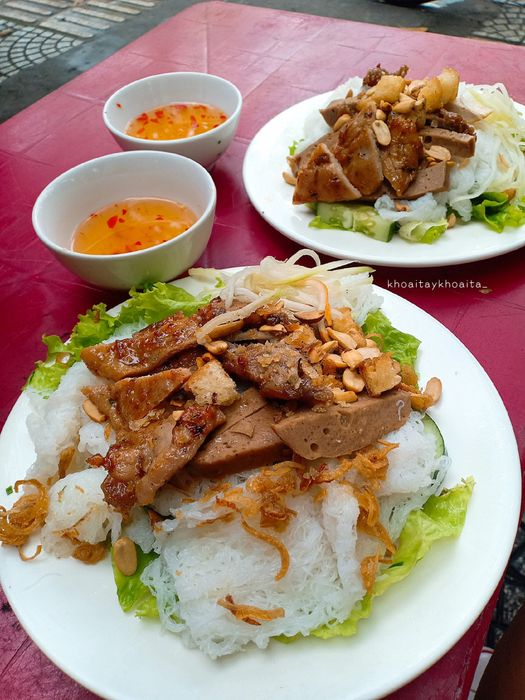 Bánh hỏi, một tên gọi quen thuộc, nhưng ở đây, nó lại trở nên đặc sắc hơn với sự kết hợp hoàn hảo của bánh hỏi và thịt heo nướng. Mẹt tròn đẹp mắt được bày trí cẩn thận với bánh hỏi ẩm dầu và hẹ xếp gọn, còn bên kia là thịt heo nướng màu sắc hấp dẫn, cắt lát vừa vặn, kèm theo ít rau và chén mắm ngon tuyệt. Tất cả tạo nên một bức tranh ẩm thực tinh tế, khiến thực khách không thể không chú ý.