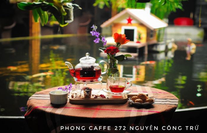 Nổi bật với thiết kế sáng tạo, Phong Cafe chọn lựa sử dụng thùng xe container làm nguyên liệu chính để xây dựng quán. Ngay từ cửa hàng, du khách sẽ bị cuốn hút bởi hồ cá chép màu sắc tươi tắn và cây xanh mát mắt. Không khí thoải mái và ấm cúng, quán là không gian lý tưởng cho những buổi hẹn hò lãng mạn hay những khoảnh khắc thư giãn sau những ngày làm việc căng thẳng.