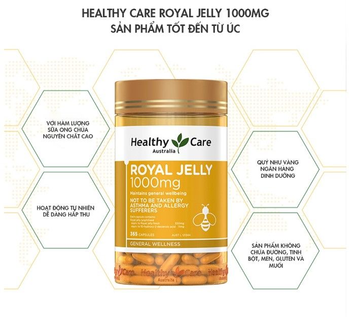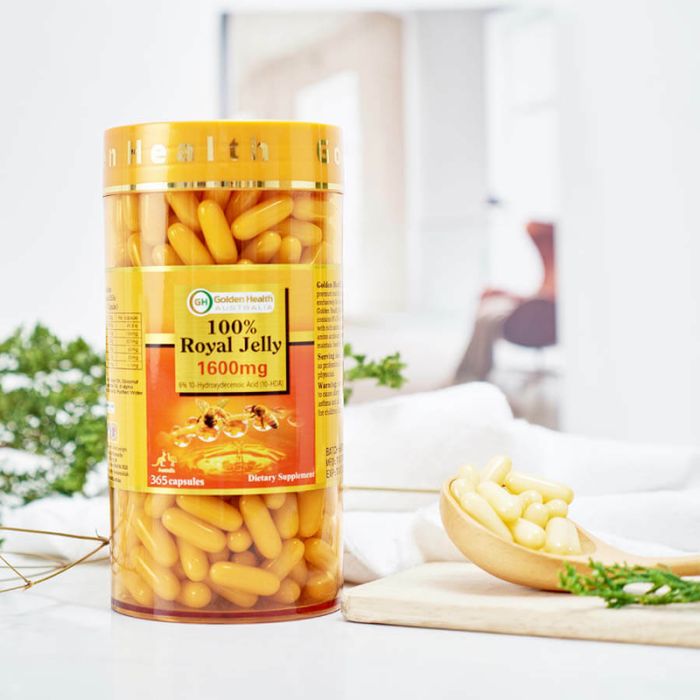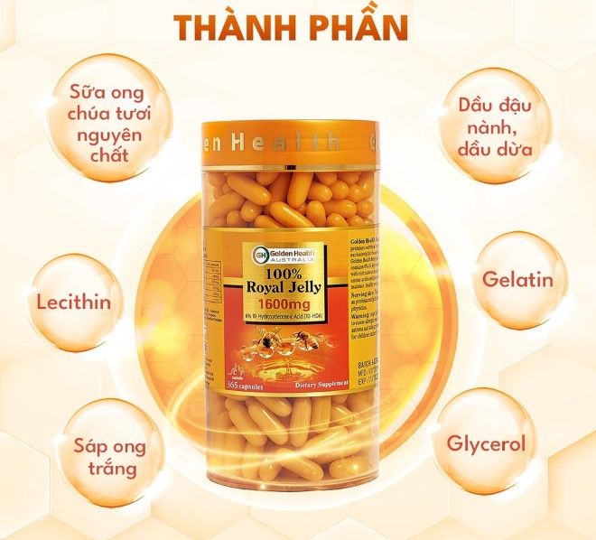 Viên sữa ong chúa Golden Health Royal Jelly được sản xuất từ loại sữa đặc biệt nuôi dưỡng con ong chúa, chứa nhiều chất bổ dưỡng hữu ích cho sức khoẻ và làn da. Sản phẩm giúp cải thiện sức khỏe, ngăn chặn quá trình lão hóa da, ngừa mụn và tàn nhang hiệu quả. Đặc biệt, sữa ong chúa Úc này hỗ trợ người suy nhược cơ thể, biếng ăn, mệt mỏi, giúp hồi phục sức khỏe nhanh chóng. Viên sữa ong chúa của Úc còn tăng cường sinh lý, điều hòa tim mạch, kích thích và phục hồi hệ thần kinh.