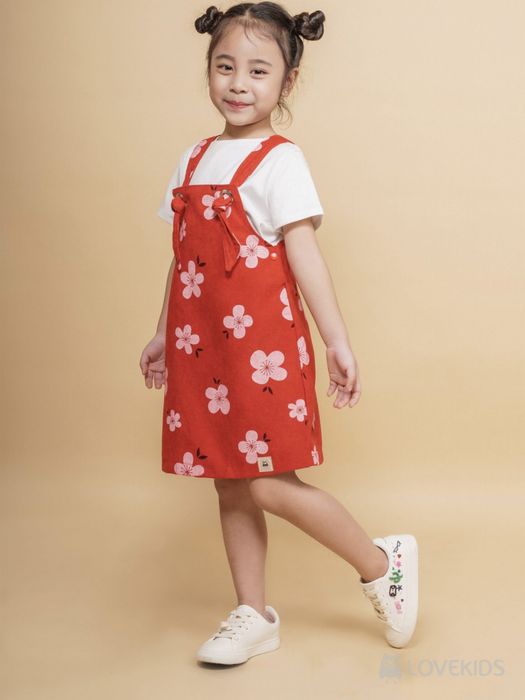 Chọn trang phục Tết cho bé gái, mẹ không thể bỏ qua bộ váy yếm. Đây là trang phục dễ thương với chất liệu dày dặn phù hợp cho thời tiết se lạnh. Kết hợp với quần legging hoặc quần tất, bé sẽ trông nổi bật và ấm áp. Nếu ở miền Nam, váy yếm mỏng, thấm hút mồ hôi là lựa chọn phù hợp. Phối cùng giày búp bê và tết tóc, bé sẽ cuốn hút mọi ánh nhìn. Mẹ có thể chọn váy yếm họa tiết hoa cỏ mang ý nghĩa của mùa xuân và Tết.