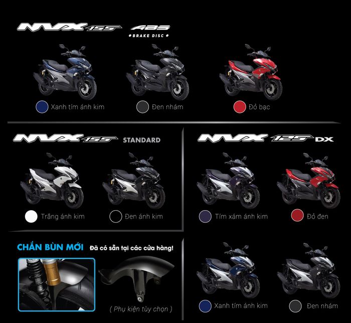 Thương hiệu xe máy nổi tiếng Yamaha đã sáng tạo 11 màu cho dòng xe NVX. Năm 2018, có 8 màu và năm 2019, thêm 3 màu mới. Yamaha NVX được phối hợp từ 2-3 màu, tạo nên sự khác biệt với màu ánh kim mạnh mẽ và cá tính.