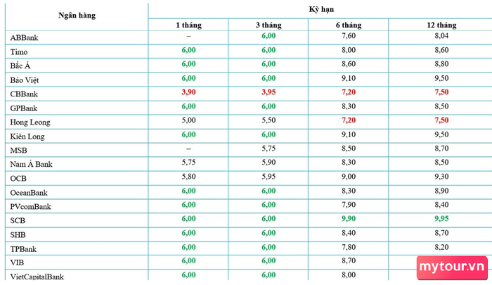 - Với kỳ hạn 1-3 tháng, lãi suất cao nhất đạt 6.0%, thuộc về Bắc Á, Timo, Đông Á, GPBank, PGBank, PVcomBank, SCB, SaigonBank, … Ngược lại, CBBank có lãi suất thấp nhất, 3.8% (kỳ hạn 1 tháng) và 3.9% (kỳ hạn 3 tháng).