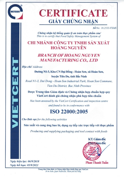 Được thành lập từ năm 1996, Công Ty TNHH Sản Xuất Hoàng Nguyên, với trụ sở tại Đường N1-3, KCN Đại Đồng, X. Hoàn Sơn, H. Tiên Du, Bắc Ninh, Việt Nam, chuyên sản xuất và kinh doanh các sản phẩm bao bì nhựa như chai nhựa, lọ nhựa, hộp nhựa và can nhựa phục vụ các ngành: Y tế, thực phẩm, dược phẩm, bảo vệ thực vật, chất tẩy rửa, dầu nhớt, hóa chất, hóa mỹ phẩm,... ➦ Chúng tôi sử dụng dây chuyền sản xuất tự động, trang thiết bị máy móc hiện đại nhập khẩu từ Nhật Bản, Đức, Đài Loan, với tổng đầu tư hàng tỷ đồng. ➦ Chất lượng sản phẩm được quản lý theo tiêu chuẩn ISO 22000:2005, từ nguyên liệu đầu vào đến thành phẩm xuất xưởng đều được kiểm tra chặt chẽ. ➦ Đội ngũ kỹ thuật viên và công nhân của chúng tôi có tay nghề cao và nhiều năm kinh nghiệm. ➦ Chúng tôi nắm bắt thị trường tốt và định vị đúng phân khúc thị trường quan trọng, tiềm năng phù hợp với doanh nghiệp. Ngoài việc sản xuất, Hoàng Nguyên Plastic còn là đối tác chính thức của các hãng lớn như Borouge (Ả Rập Xê Út), Daelim (Hàn Quốc), Lotte (Hàn Quốc), Chevron Phillips (USA), Tainan (Đài Loan). Với mạng lưới bán hàng trải dài từ Bắc chí Nam, chúng tôi cam kết mang đến cho khách hàng chất lượng sản phẩm, giá thành, dịch vụ và hậu mãi tốt nhất. Các sản phẩm của chúng tôi bao gồm: Chai sữa chua, chai nhựa đựng dầu ăn, chai nhựa đựng mỹ phẩm, chai nhựa đựng nước giặt, can nhựa 10 lít, can nhựa 20 lít, và nhiều loại bao bì nhựa khác phục vụ nhu cầu đa dạng của thị trường.