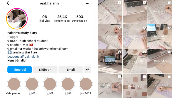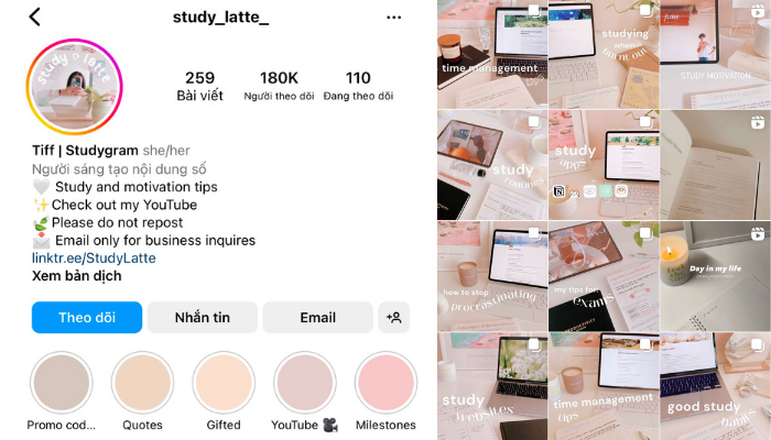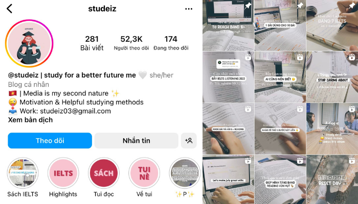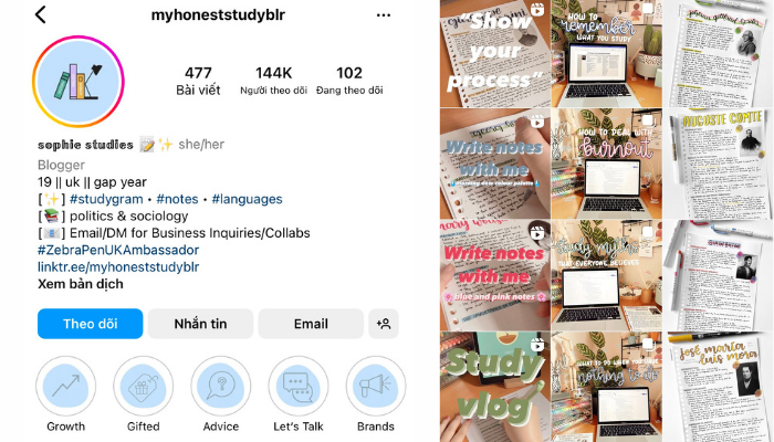 Khám phá Instagram của Sophie - cô gái 19 tuổi từ Anh Quốc, nơi cô chia sẻ kiến thức thành 3 phần rõ ràng: ghi chú, mẹo học tập và vlog. Dù là trang mạng xã hội nước ngoài sử dụng tiếng Anh, nhưng đừng bỏ qua myhoneststudyblr! Sophie sẽ mang đến cho bạn rất nhiều thông tin hữu ích.