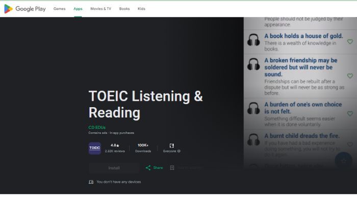 Ngoài các trang web chất lượng, TopTip giới thiệu một ứng dụng luyện thi TOEIC rất hữu ích - TOEIC Listening & Reading. Ứng dụng này được đánh giá cao với nhiều tính năng đa dạng và kiến thức phong phú giúp cải thiện kỹ năng nghe đọc một cách hiệu quả nhất. Với hơn 3000 câu hỏi và 600 từ vựng TOEIC, bạn có thể học ở cả hai chế độ trực tuyến và ngoại tuyến. Sau quá trình học, bạn sẽ nâng cao kiến thức ngữ pháp, phát âm, thành ngữ và cụm từ tiếng Anh.