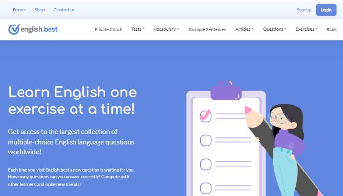 Nếu bạn muốn tìm trang web đơn giản, dễ sử dụng để ôn luyện TOEIC, hãy thử English.best. English.best giúp kiểm tra trình độ tiếng Anh của bạn thông qua bài test. Bạn có thể biết được trình độ của mình và chọn bài học phù hợp. Bài tập của English.best chia thành 6 chủ đề lớn: - TOEIC Photographs, TOEIC Question - Responses, TOEIC Conversations, TOEIC Short Talks, TOEIC Text Completion, TOEIC Reading Comprehension. Mỗi bài tập có đáp án và transcript để bạn có thể xem lại lỗi của mình.