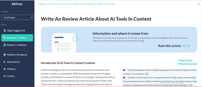 Tuy nhiên, điểm yếu rõ nhất ở đây là công cụ này chưa hỗ trợ Tiếng Việt cho người dùng và không hoàn toàn miễn phí. Đây là một ví dụ của AI Writer khi tôi yêu cầu nó viết một bài đánh giá. Đặc biệt, nó còn trích dẫn nguồn từ các bài viết mà nó tham khảo.