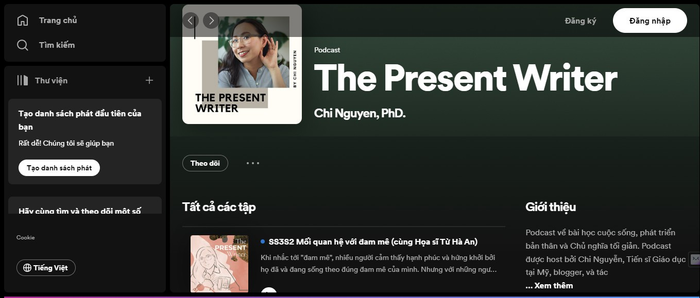 Trên 'The Present Writer', bạn sẽ tìm thấy các tập podcast với các chủ đề đa dạng như kỹ thuật viết, công nghệ sáng tạo, quy trình sáng tác, chia sẻ kinh nghiệm và nhiều hơn thế nữa. Các tập podcast được thực hiện bởi những người viết hàng đầu, có kinh nghiệm và hiểu biết sâu sắc về quy trình sáng tạo và cách phát triển công việc viết sáng tạo. Kênh cung cấp lời khuyên thực tế và các kỹ năng cần thiết cho việc viết sáng tạo. Bạn sẽ học cách tổ chức ý tưởng, cải thiện lối viết và xây dựng một phong cách riêng. Bên cạnh đó, những câu chuyện truyền cảm hứng từ các nhà văn nổi tiếng và thành công cũng sẽ được chia sẻ để tạo động lực cho người nghe.