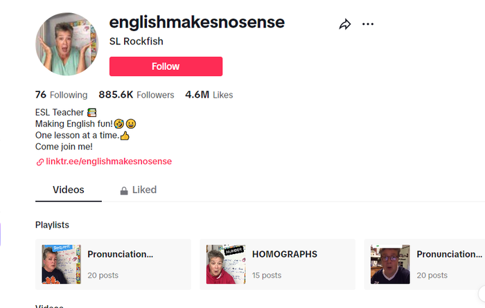 English Make Nosense là kênh TikTok của bà SL Rockfish. Trên kênh này, bà chủ yếu giải thích những điều kỳ lạ và khó hiểu trong tiếng Anh. Video ngắn gọn, chỉ khoảng 1-2 phút.