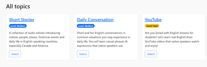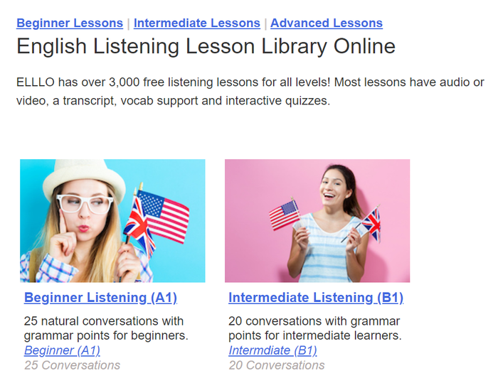 Đối với những bạn yếu về phần Nghe có thể tham khảo trang web này để nâng cao khả năng của mình. Trang web cung cấp các đoạn văn ngắn theo từng chủ đề và từng cấp độ khác nhau để phù hợp với trình độ của người học. Mỗi bài học bao gồm một đoạn văn đối thoại ngắn và một file nghe để bạn thực hành kỹ năng Nghe của mình. Sau đó là những câu hỏi ngắn để tổng hợp bài học và ôn lại từ mới.