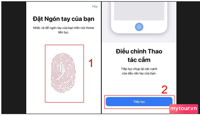 Bước 3: Đặt và giữ ngón tay muốn lấy vân tay lên nút Home. Khi màn hình hiển thị Điều chỉnh Thao tác cầm, chọn Tiếp tục.