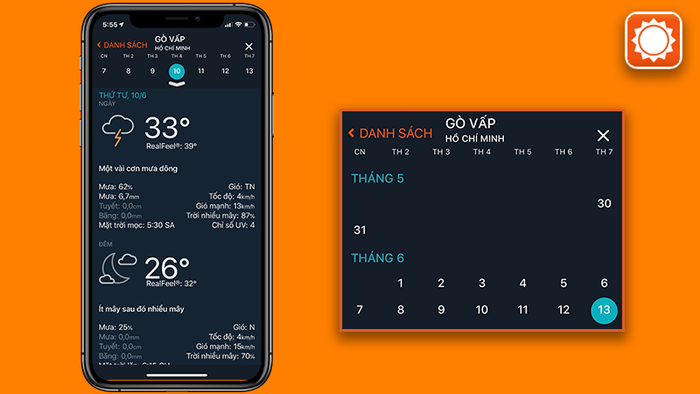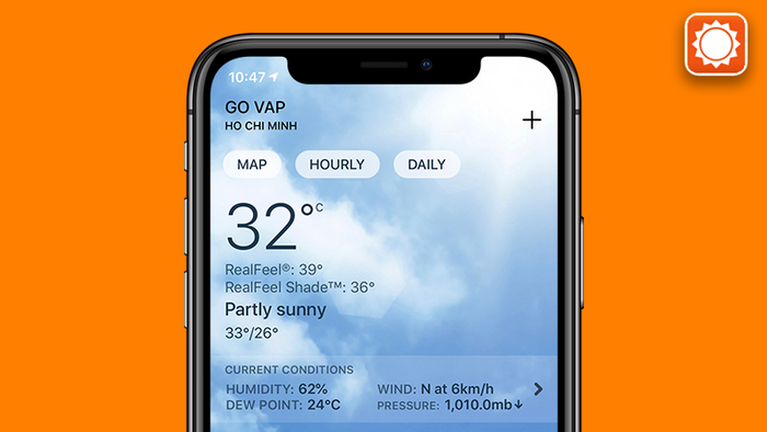 Hiển thị trực tiếp thông tin thời tiết với các chỉ số như nhiệt độ, RealFeel, độ ẩm, gió, và khí áp ngay trên trang chủ khi bạn mở ứng dụng (nếu bạn cho phép ứng dụng truy cập vị trí của bạn).