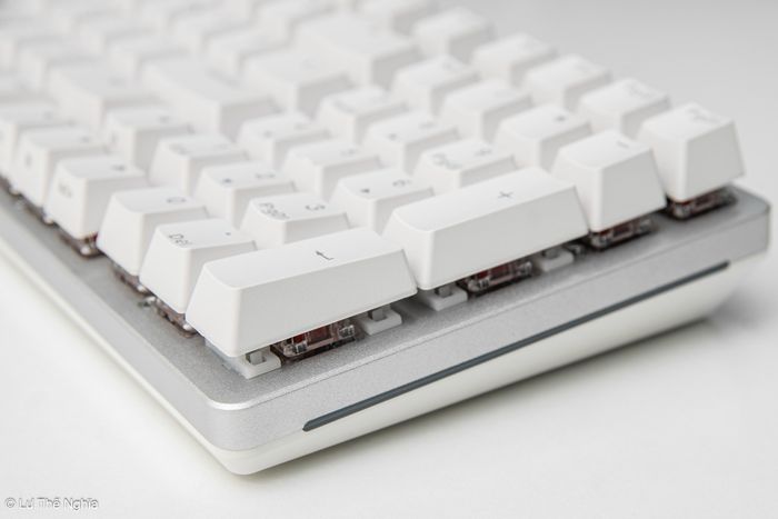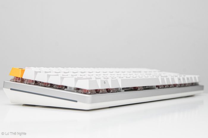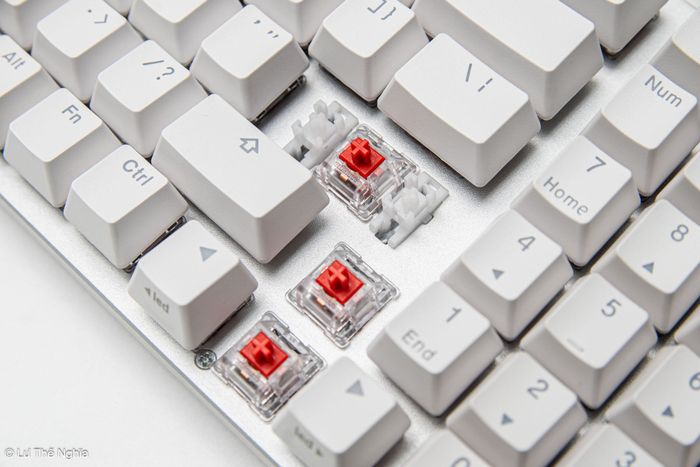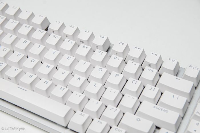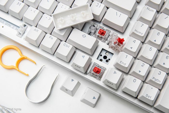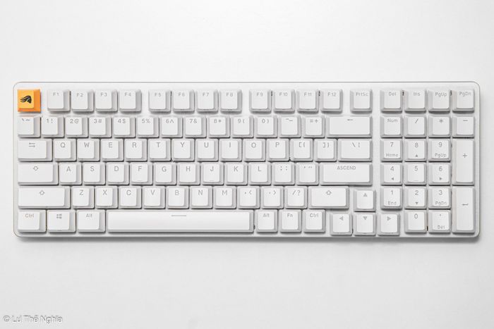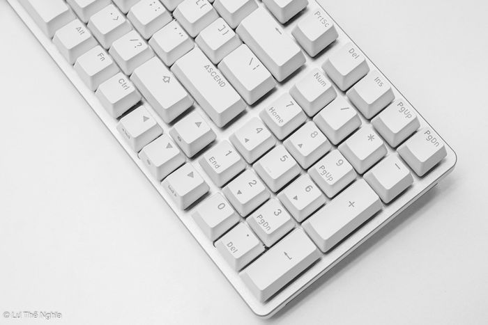 Bước tiếp đến với bàn phím, GMMK 2 mặc định được trang bị keycap ABS doubleshot xuyên LED, giúp ký tự sáng bừng trong môi trường tối. Với layout 96%, bàn phím trông gọn gàng và phím được bố trí hợp lý, chỉ trừ cụm phím mũi tên và numpad màu mình dễ nhầm lẫn.