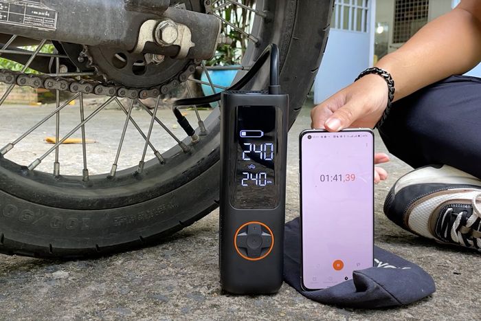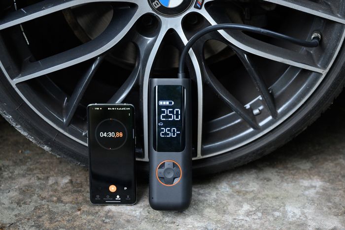 Bơm lốp xe hơi tốn khoảng 4 phút 35 giây để đạt áp suất mong muốn. Mặc dù máy được set là 2,5 bar, nhưng thực tế phải bơm lên 2,55 bar mới dừng lại. Tuy nhiên, máy vẫn có thể điều chỉnh để bơm đúng áp suất cần thiết.