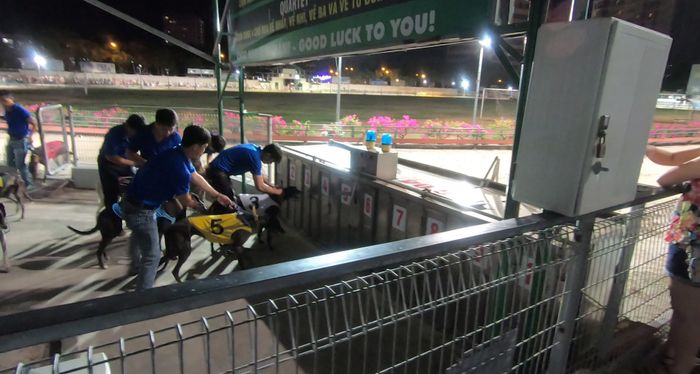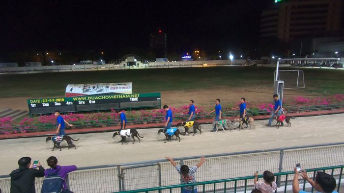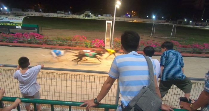 Trường đua chó mang tên Trường đua Lam Sơn, nằm trên đường Lê Lợi. Ngay khi bước vào, mình đã thấy một chú chó đua đứng ngay đó để khán giả chụp hình, với vẻ ngoài mảnh khảnh và vui vẻ, không có gì phải lo sợ cả.