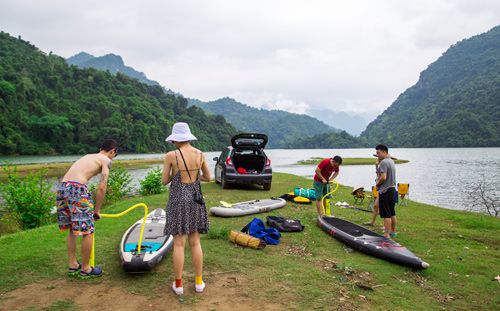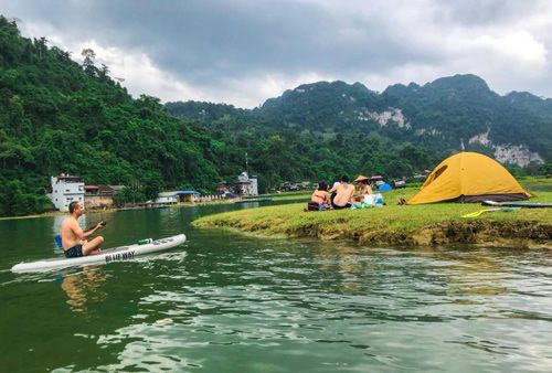 Nhóm bạn từ Hà Nội đã có khoảng thời gian thư giãn khi lưu lại nhà sàn, tự nấu ăn và cùng nhau trải nghiệm lướt ván trên hồ Ba Bể, Bắc Kạn.