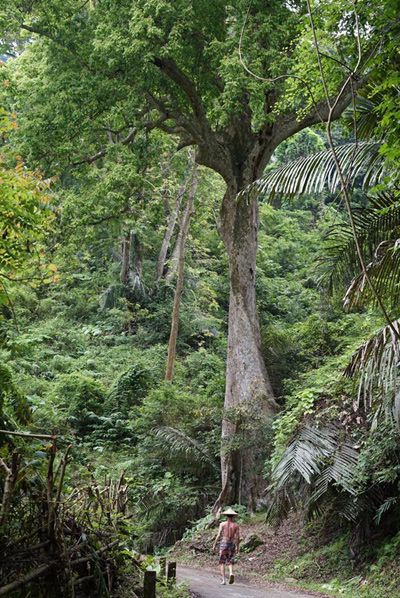 Sau khi ăn sáng xong, mọi người quyết định đi theo con đường ven rừng để đến hồ. Những cây lớn già nhiều năm tuổi bên đường cao như ngôi nhà 5 tầng với tán lá xanh mướt, thân lớn 5-6 người ôm không nổi.