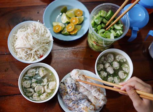 Đến giờ trưa, chúng tôi trở về lều và thưởng thức xúc xích, hoa quả cùng mì tôm, đồ ăn vừa nấu và cùng chia sẻ về chuyến đi của mỗi người.