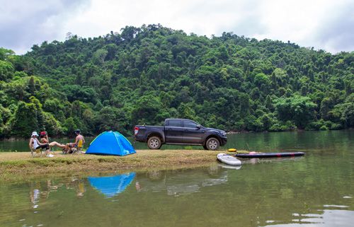 Chúng tôi dựng hai chiếc lều để chứa ít đồ cá nhân và đồ ăn vào bên trong để tránh ánh nắng mặt trời làm hỏng. Sau đó, cả nhóm bơm Sup và lên đường chèo lượn vòng quanh hồ. Một vài người bạn ở trên bờ, ngồi trên ghế gấp để nghe tiếng chim hót, thưởng thức hoa quả hay đung đưa nghe nhạc giữa núi rừng nơi đây.