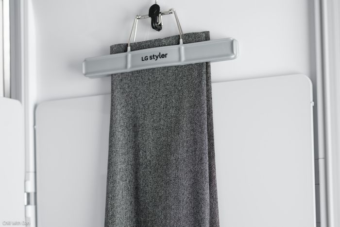 - Với quần tây dễ bị nhàu nhĩ khi đứng lên hoặc ngồi xuống, LG Styler có phần nẹp quần ở cửa, giúp quần áo giữ nếp một cách nhanh chóng trong chỉ 20 phút.