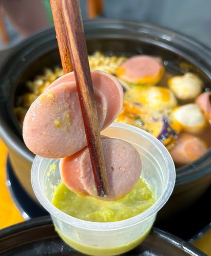 Phần topping đa dạng, trong bát mì thập cẩm mà mình ăn có tôm, mực, bạch tuộc tươi sống, chấm muối ớt xanh, kèm theo nhiều loại rau nấm, cá viên, xúc xích, thực sự đầy ắp!