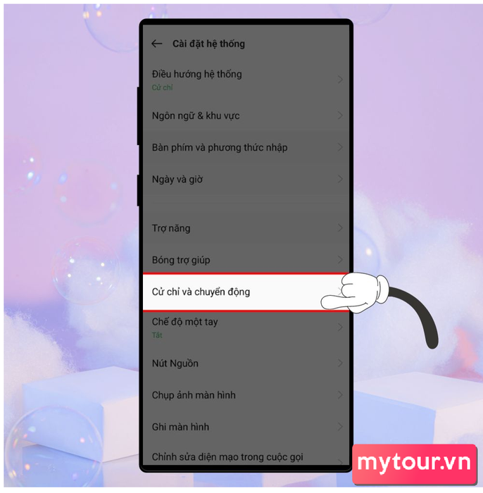 Bước 2: Tìm đến mục Cử chỉ và chuyển động và nhấn vào đó, đây là nơi bạn có thể tùy chỉnh và bật các tính năng điều khiển không cần chạm.