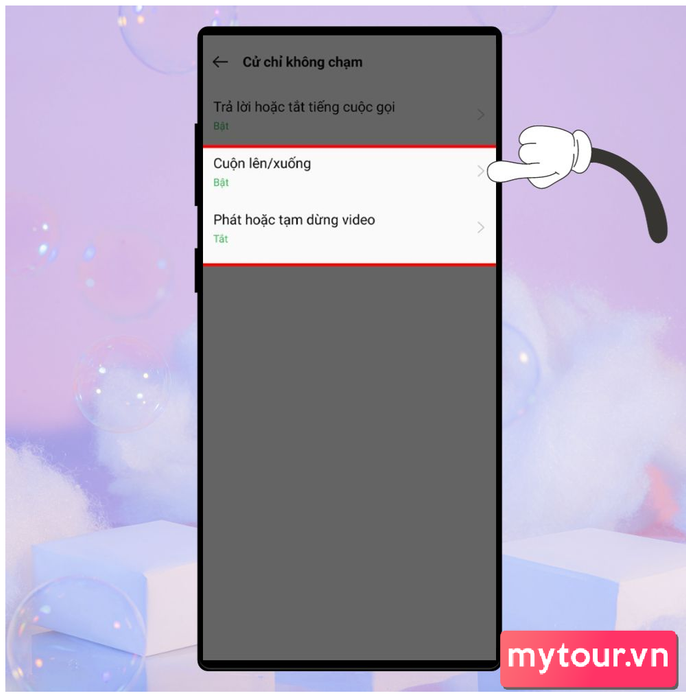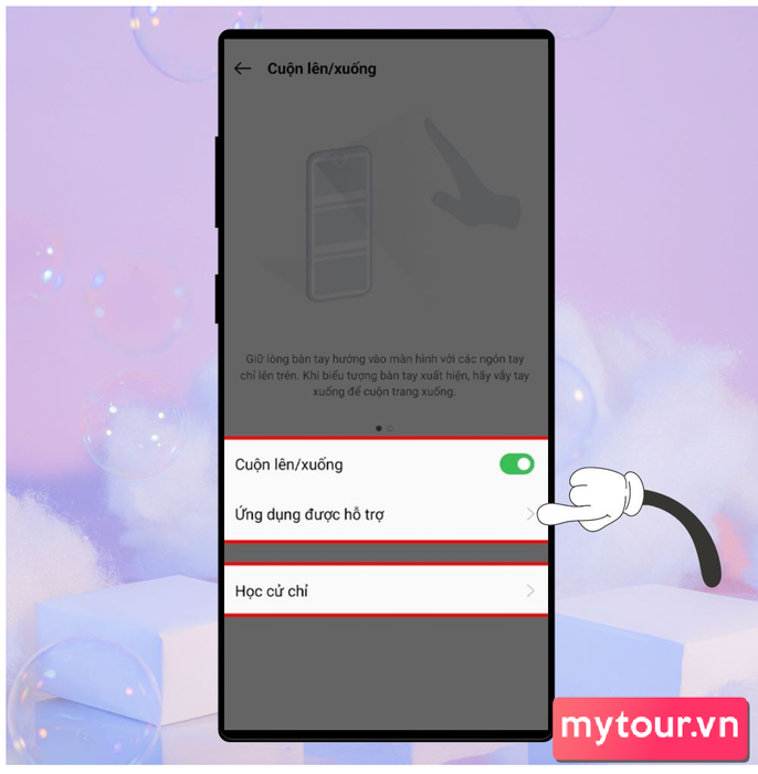 Bước 5: Ở phần Cuộn lên/xuống, ở đỉnh màn hình sẽ hiển thị hướng dẫn chi tiết về cách thực hiện các cử chỉ không cần chạm. Bật công tắc Cuộn lên/xuống. Nếu bạn cảm thấy khó khăn, bạn cũng có thể xem Hướng dẫn cử chỉ để hiểu rõ từng bước chi tiết.
