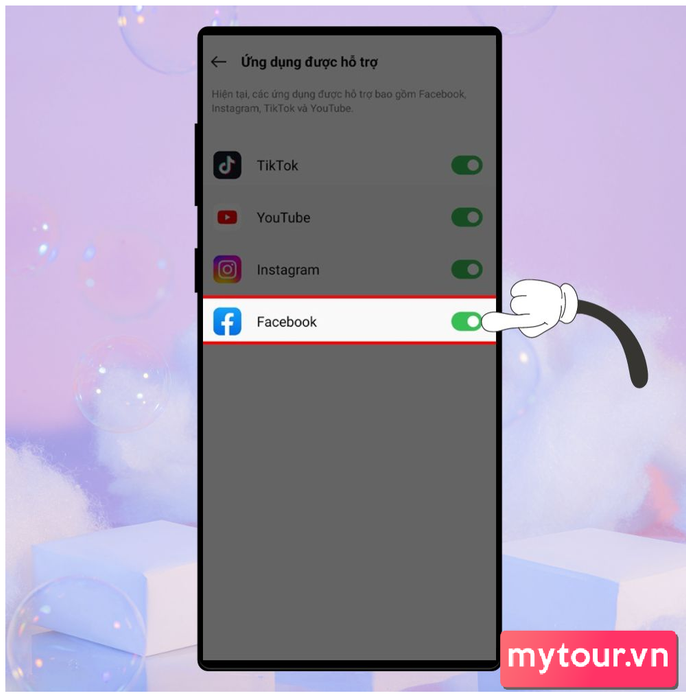 Bước 6: Đồng thời, đảm bảo rằng trong phần Ứng dụng được hỗ trợ, Facebook đã được bật.