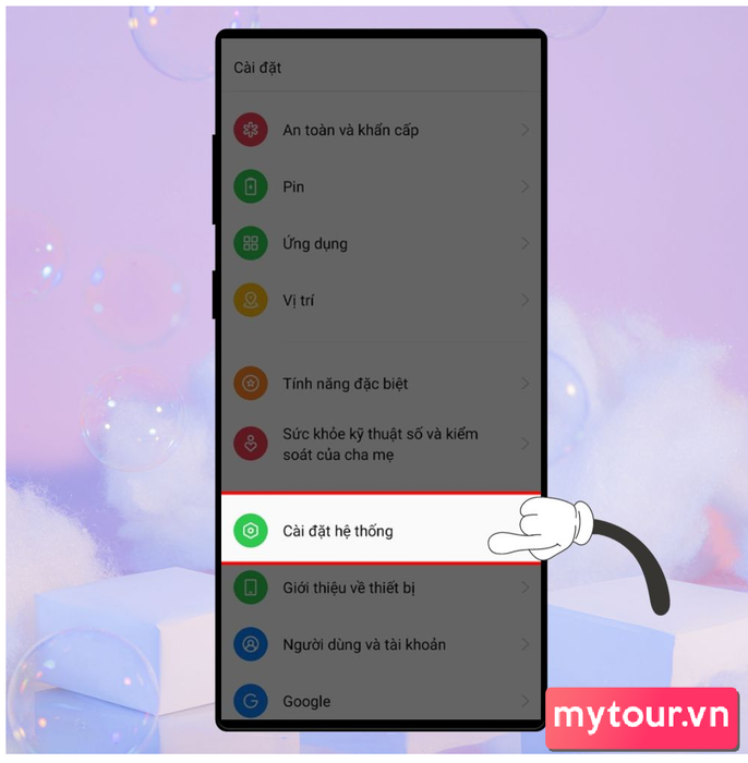 Bước 1: Để tận dụng tính năng lướt Facebook không cần dùng tay trên OPPO, trước hết, bạn cần bật chức năng cử chỉ không chạm. Vào Cài đặt trên điện thoại, sau đó chọn Cài đặt hệ thống.