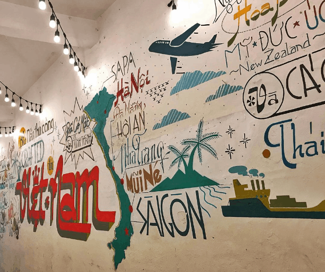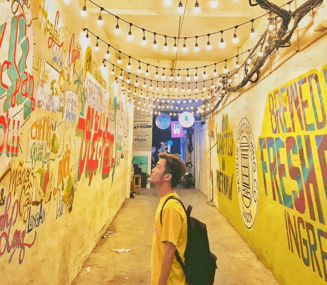 Bức tường xung quanh được trang trí bằng những dòng chữ kỳ quặc, mô phỏng tên các địa danh nổi tiếng của Việt Nam. Những dòng chữ đầy màu sắc tạo nên bức phông sống ảo tuyệt vời cho giới trẻ. Đặc biệt, khi bình minh buông xuống, những dây đèn vàng rải rác trên trần tạo nên con hẻm như một đường hầm ánh sáng lung linh và ảo diệu.
