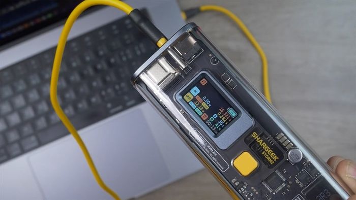 Shargeek Storm 2 Liquid trang bị màn hình để người dùng dễ dàng quản lý và điều chỉnh các thông số. Nguồn: Han's Tech Talk.Shargeek Storm 2 Liquid nặng khoảng 592.6 gram, một chút nặng hơn so với một số pin sạc dự phòng khác nhưng vẫn tiện lợi khi mang theo đi làm, du lịch. Mình đã trải nghiệm và thấy khá ổn định.
