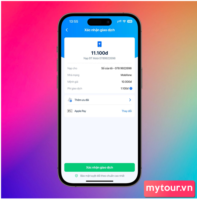 Trước mỗi giao dịch, thiết bị thanh toán sẽ xác thực bằng vân tay TouchID hoặc nhận dạng khuôn mặt FaceID. Nếu sử dụng Apple Watch hoặc iPhone không hỗ trợ vân tay và khuôn mặt, bạn có thể sử dụng mật khẩu để xác thực.Apple Pay đã tích hợp trên Ví ZaloPay