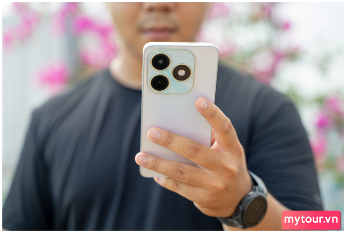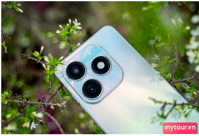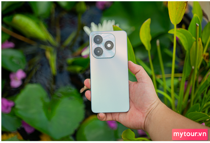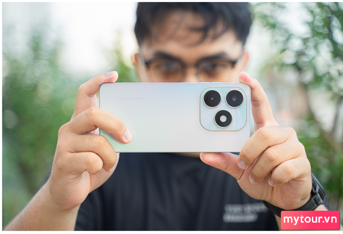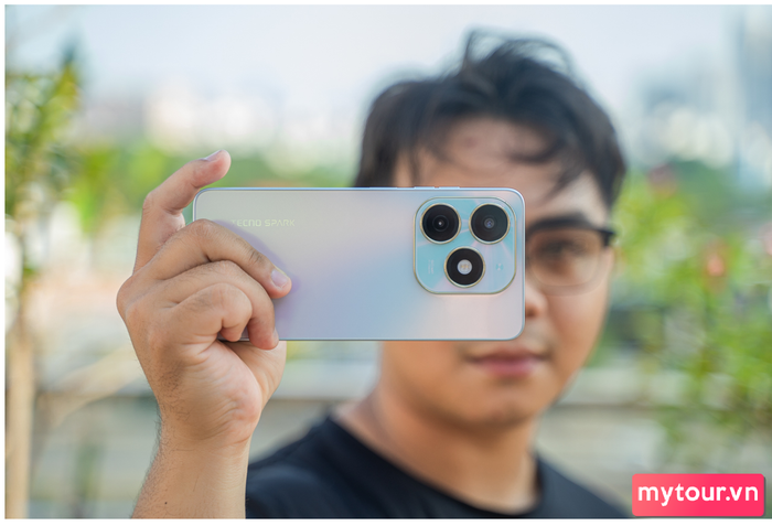 Mặt sau của Tecno Spark 20 sử dụng chất liệu nhựa nhám, mang lại cảm giác sờ vào rất mềm mại. Thiết kế đơn giản nhưng vô cùng đẹp mắt, đặc biệt là khu vực camera được làm trông như “iPhone”, với viền vàng nổi bật. Mặc dù có vẻ là 3 camera, nhưng thực tế chỉ có 2 camera chính (50MP và camera phụ 0.08MP) cùng đèn Flash LED được tinh tế bố trí.