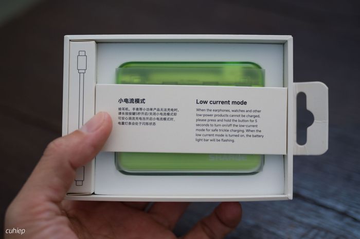 Hướng dẫn cách sạc các thiết bị có điện thế thấp. Khi nào bạn cắm tai nghe hoặc đồng hồ vào mà không thấy sạc, hãy nhấn nút trắng trên đầu trong 5 giây để kích hoạt chế độ sạc. Có chút phức tạp nhưng nó vẫn hữu ích. Mặc dù có vẻ rắc rối, nhưng đẹp thì bù lại sẽ khiến bạn hài lòng.