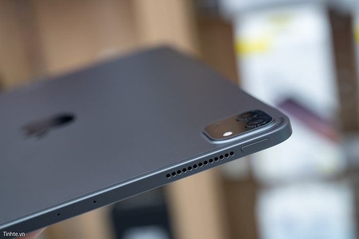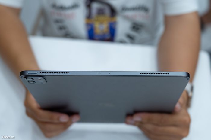Ở cạnh dưới có cổng USB-C và 2 cụm loa, được sắp xếp gọn gàng và đẹp mắt. Cổng USB-C trên iPad Pro tương thích với hầu hết các thiết bị có cổng C truyền dữ liệu hiện nay, tuy nhiên, Apple vẫn chưa nâng cấp lên Thunderbolt 3.