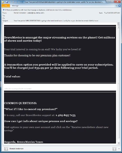 Dịch vụ phát sóng giả mạo của họ chỉ là một phần của một quy trình phức tạp, gồm bảy bước, để triển khai một loại cửa sau gọi là BazaLoader. Họ bắt đầu bằng một email, chắc chắn. Nhưng nó không chứa bất kỳ liên kết độc hại nào, không có tệp đính kèm nhiễm độc mà cảm biến của Gmail có thể phát hiện ra. Thay vào đó, nó đơn giản thông báo cho bạn biết rằng giai đoạn thử nghiệm miễn phí của bạn trên BravoMovies—“giữa các dịch vụ phát sóng hàng đầu trên hành tinh!”—đang kết thúc, và thẻ tín dụng của bạn sắp bị tính tiền cho “gói cao cấp.” Nó cung cấp một số điện thoại để gọi nếu bạn muốn hủy bỏ.