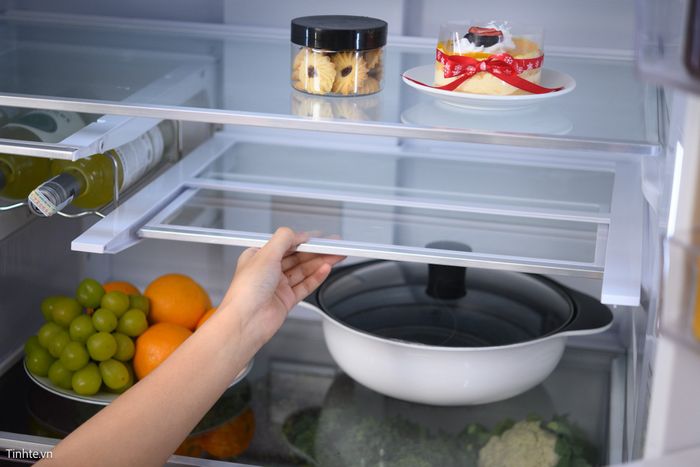 Khay kính linh hoạt có thể được gấp gọn hoặc kéo dài để thay đổi độ cao cho ngăn bên dưới.