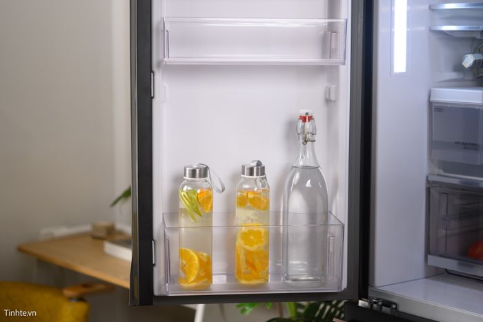 Khu vực lấy nước bên ngoài được thiết kế tiện lợi và nhanh chóng đáp ứng nhu cầu uống nước lạnh. Bình nước áp dụng công nghệ kháng khuẩn và khử mùi, đảm bảo vệ sinh và an toàn cho người dùng.Thiết kế bên trong tủ