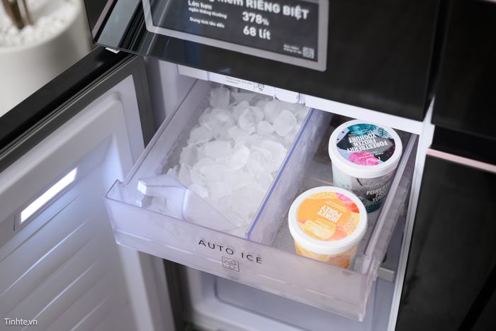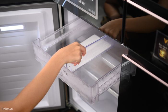 Khay đựng đá được trang bị thêm tấm ngăn, giúp chia ngăn làm đá để tạo thêm không gian cho kem và thực phẩm lạnh khác.