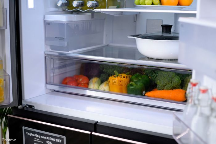 Lớp làm lạnh bên ngoài khoang Fresh Safe không thổi khí lạnh trực tiếp vào bên trong, tránh làm cho rau củ nhanh héo.Tự làm đá với dung tích lên đến 5 lít