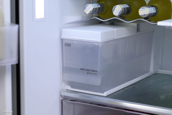 Hộp chứa nước để tự làm đá được đặt ở ngăn mát của tủ lạnh, có dung tích lên đến 5 lít, chỉ cần đổ nước một lần là đủ để sử dụng trong nhiều ngày (tùy thuộc vào nhu cầu của gia đình). Hộp làm từ vật liệu chống khuẩn đặc biệt và có bộ lọc than hoạt tính để loại bỏ mùi.