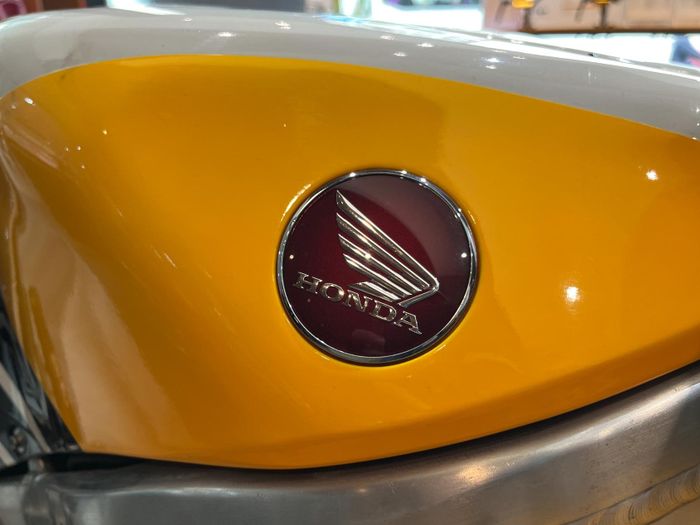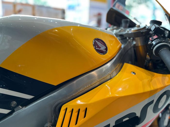 Màu sắc đỏ rực rỡ trên Logo Honda khiến cho mọi ánh nhìn không thể rời mắt. Kết hợp với gam màu vàng cam của Repsol, RC213V trở thành một trong những siêu phẩm nổi bật nhất trên đường đua.